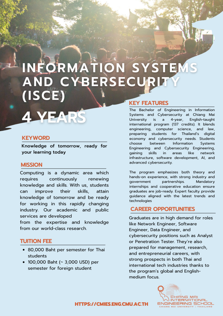 The Bachelor of Engineering in Information Systems and Cybersecurity is a comprehensive 4-year international program offered by the Faculty of Engineering at Chiang Mai University, requiring a minimum of 137 credits for graduation. This cutting- edge program uniquely combines interdisciplinary knowledge from engineering, computer science, and law to address the growing demands of Thailand’s digital economy and national cybersecurity policies. Students can specialize in either Information Systems Engineering or Cybersecurity Engineering, gaining expertise in critical areas including network infrastructure, software development, data analytics, artificial intelligence applications, and advanced cybersecurity technologies.